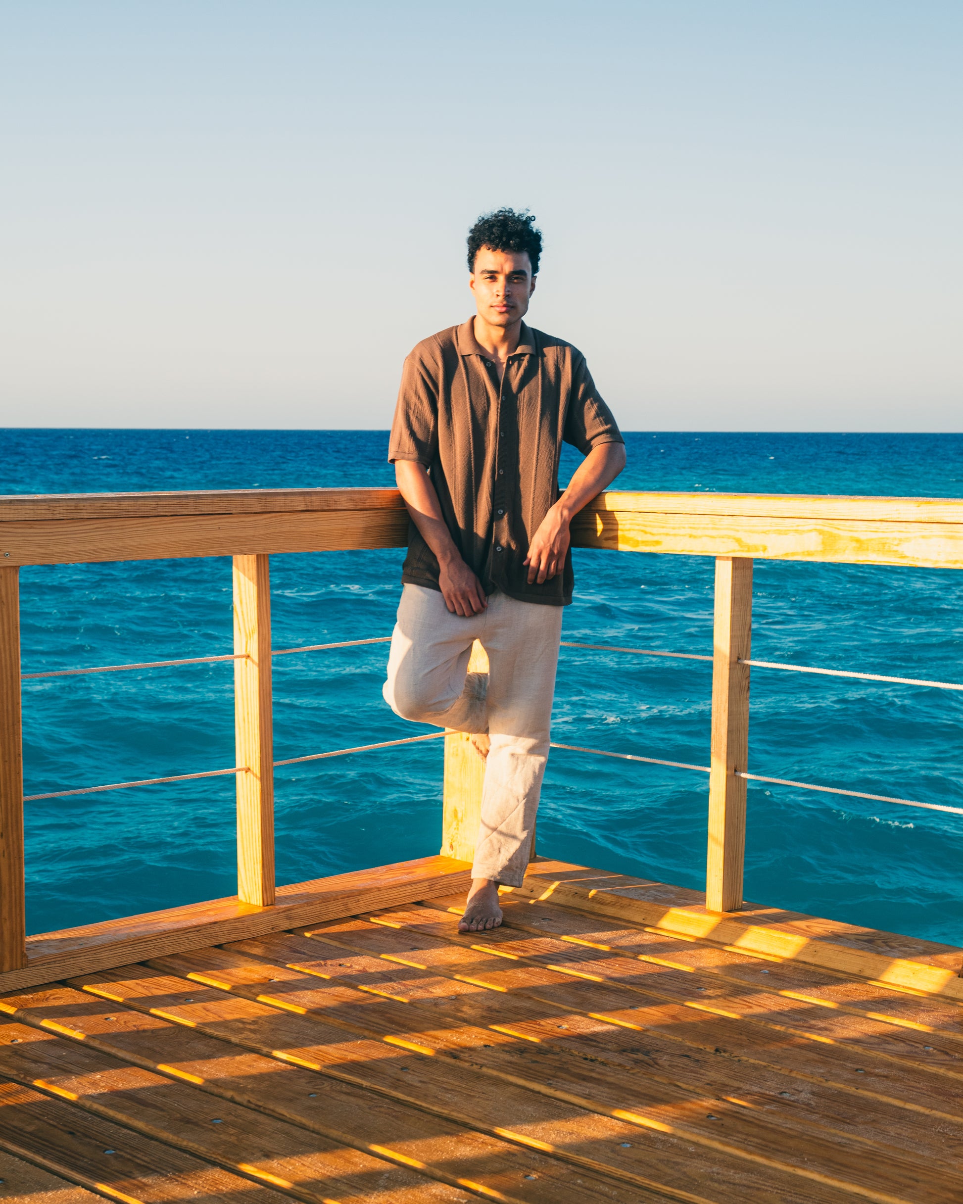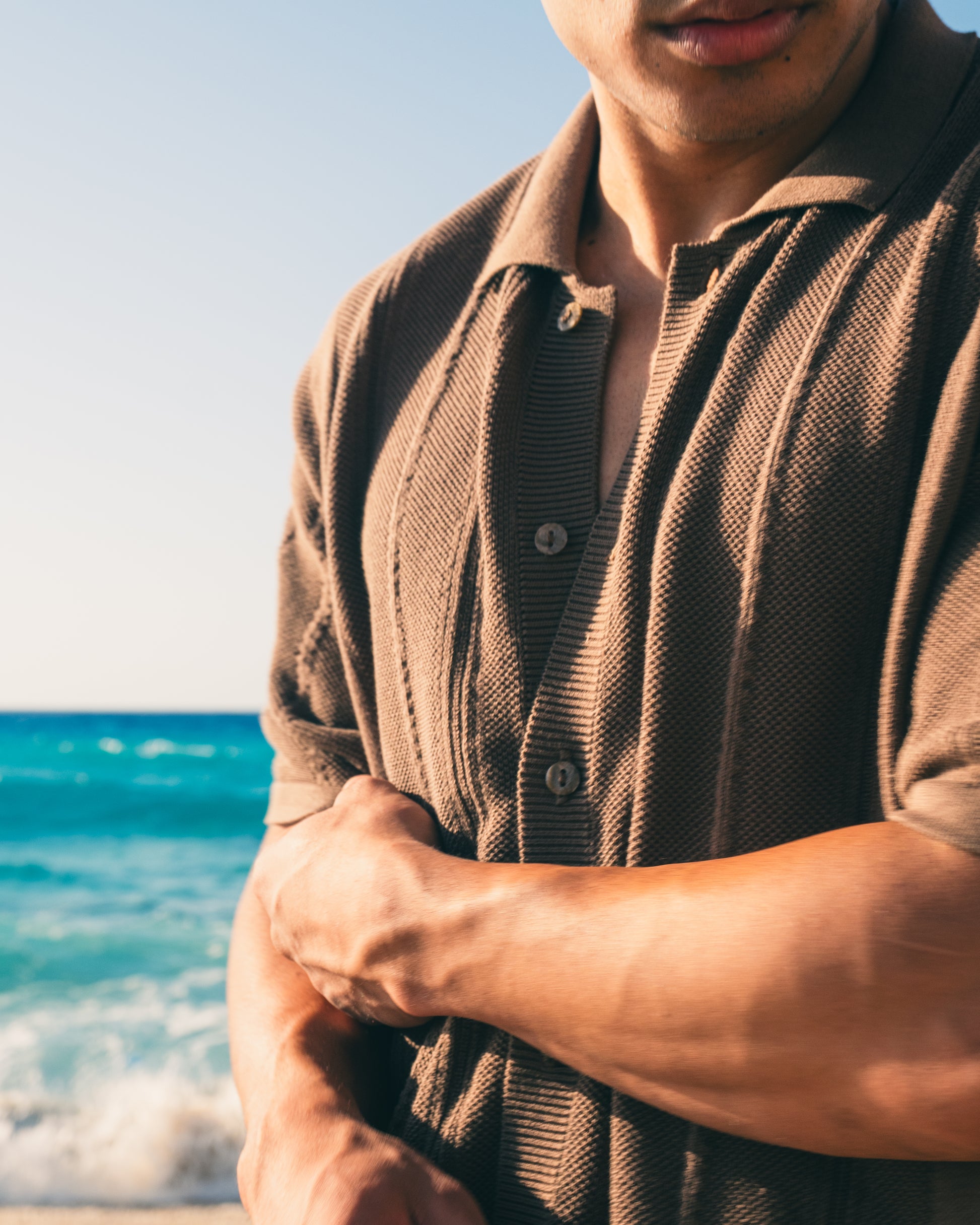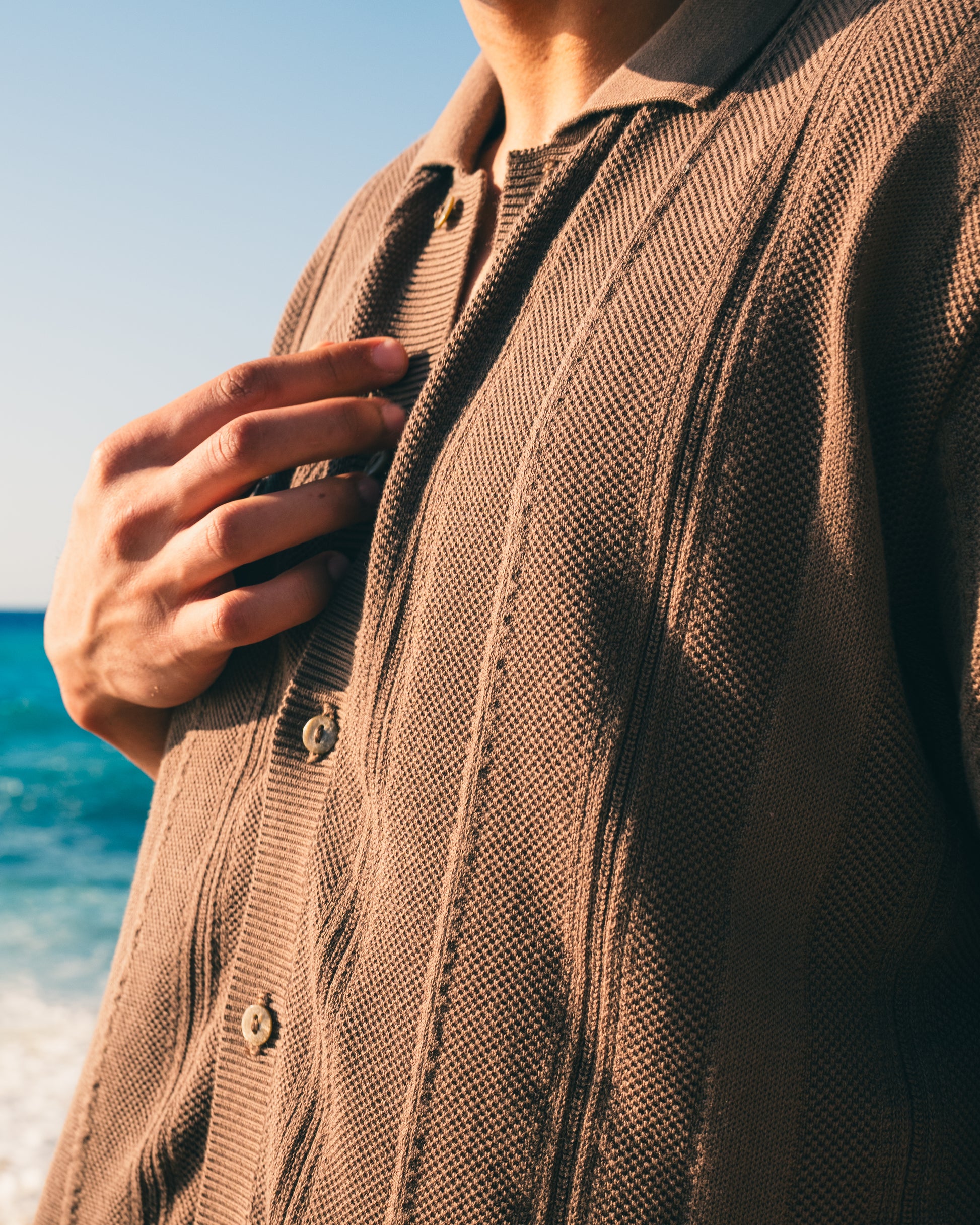 The ‘Nuance’ Knitted Shirt is a brown knitted men’s shirt with soft, textured lines. Lightweight and breathable, it offers a relaxed yet elevated fit. Its earthy tone mimics the shade of sand and stands apart as a deeper tone within the collection, offering subtle contrast, a nuance in itself.