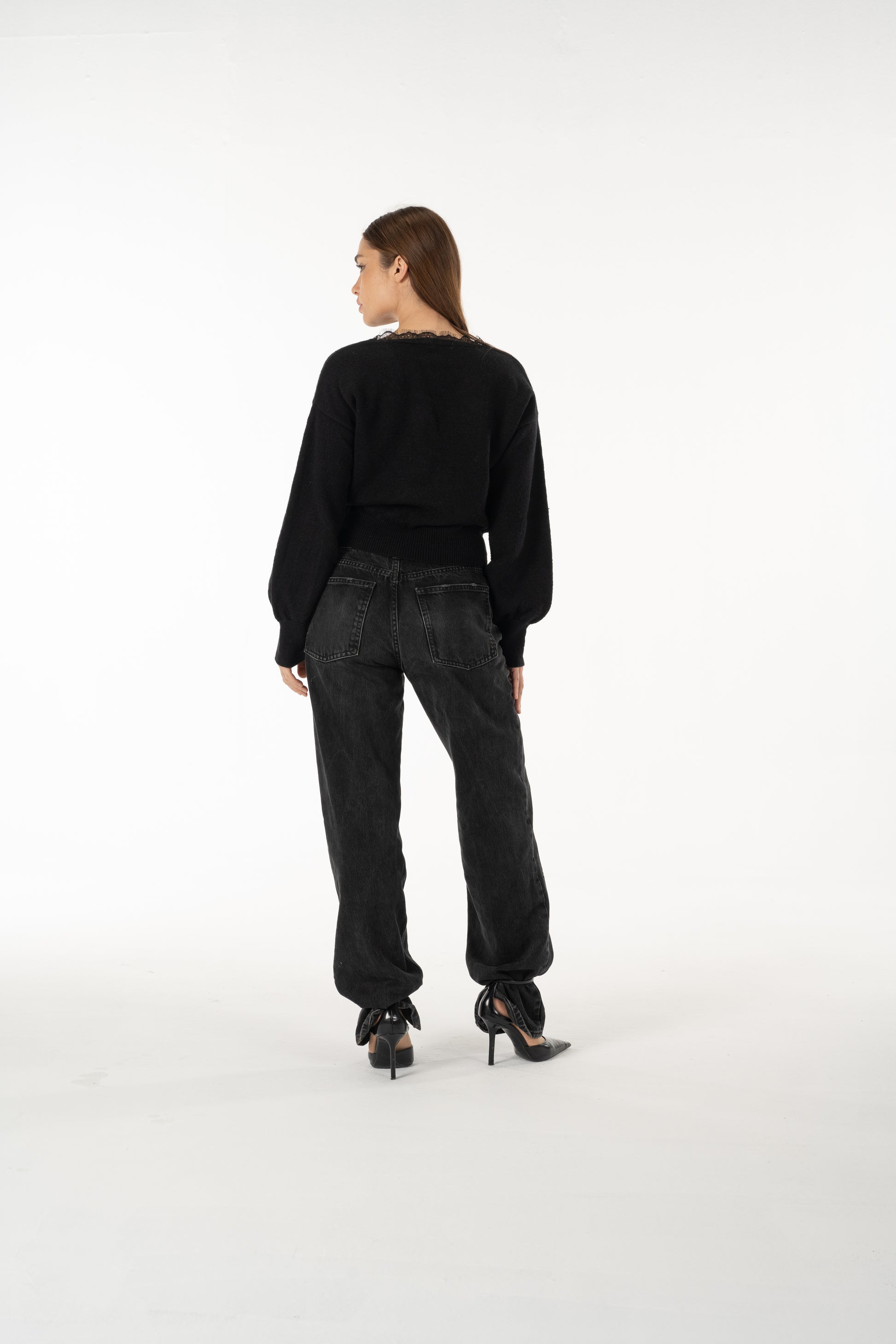 The 'Voile' Top is a knitted top with lace detailing along the edges, inspired by the idea of fabric acting as a veil that softens light and creates subtle shadows. Designed with a reversible V neckline, it can be worn at the front or the back.
